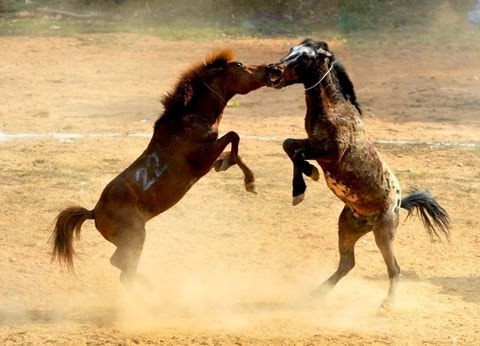 The mat is inside the circular line. A beautiful mare was put on for two male to vie with each other. The horse that gets out of the line twice is considered the loser.
